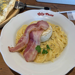 Jolly Pasta's atmosphere can best be summed up as weird Japanese-Italian fusion food (if you've always wanted to eat spaghetti with shishamo and a fried egg, look no further), ~authentic~ Italian music (JK, it was flamenco and Franco De Vita), and standard fare table-and-booth seating, complete with a 'smoking section' that is in no way walled off or separate from the main seating area. Some locations have half-hearted stencils of vines or Italian quotes, or a faux brick accent wall. Most have theatre-sized posters of their recommended dishes or seasonal specials.
